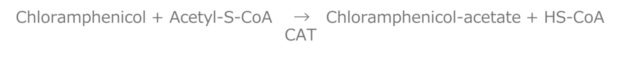 クロラムフェニコールアセチルトランスフェラーゼ(CAT)はクロラムフェニコール(Cm)にアセチルコエンザイムA (AcCoA)のアセチル基を転移する酵素です。この反応の結果生じたHS-CoAの量よりCATタンパク質の活性を定量します。HS-CoAはエルマン試薬(Ellman’s reagent, DTNB)を用いて発色定量します。(参考文献1)