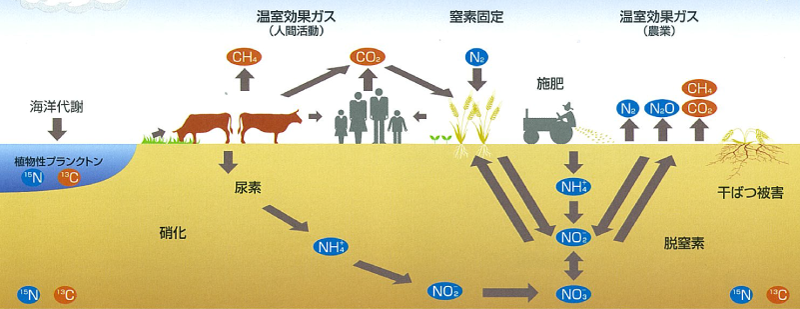 窒素安定同位体比(σ15N)は食物連鎖に従って、濃縮していくことが知られています。炭素安定同位体比(σ13C)は初期生産者(陸上〜植物、海洋〜プランクトン)の値を反映します。これより安定同位体比は食物連鎖などの生態系を知る手がかりとなります。